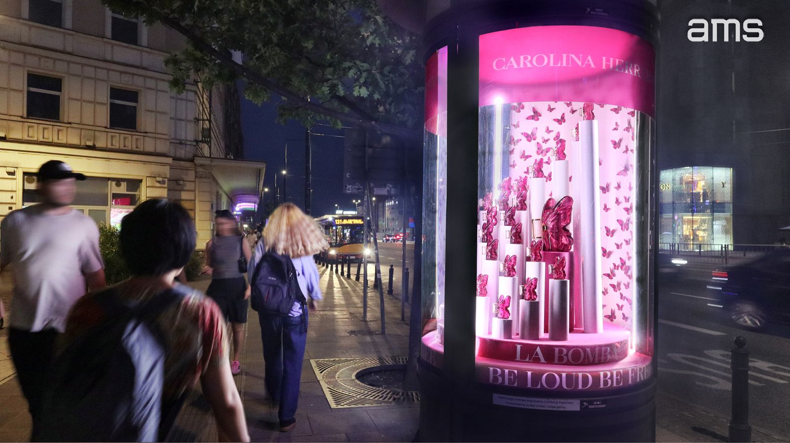 Podczas kampanii perfum La Bomba marki Carolina Herrera klient postawił na niestandardowe rozwiązanie. Zamiast klasycznej reklamy wykorzystał wyjątkową formę pełną trójwymiarowych motyli, które natychmiast przyciągały uwagę przechodniów, tworząc wrażenie głębi i dynamiki. W jej wnętrzu znajdowały się 24 flakony perfum, w tym jeden spektakularnie powiększony, dzięki czemu cała kreacja wydawała się niemal ożywać.